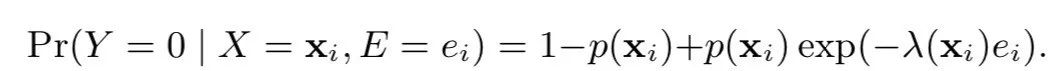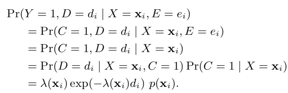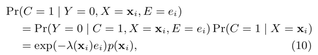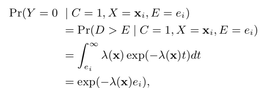 如果用户还未发生转化(Y=0),那么存在两种情况:C=0 或者C=1 & E < D。即,。