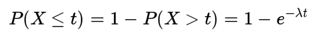 反过来,事件在时间 t 之内发生的概率(至少访问一次的概率),就是1减去上面的值,即