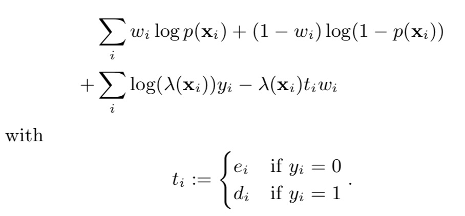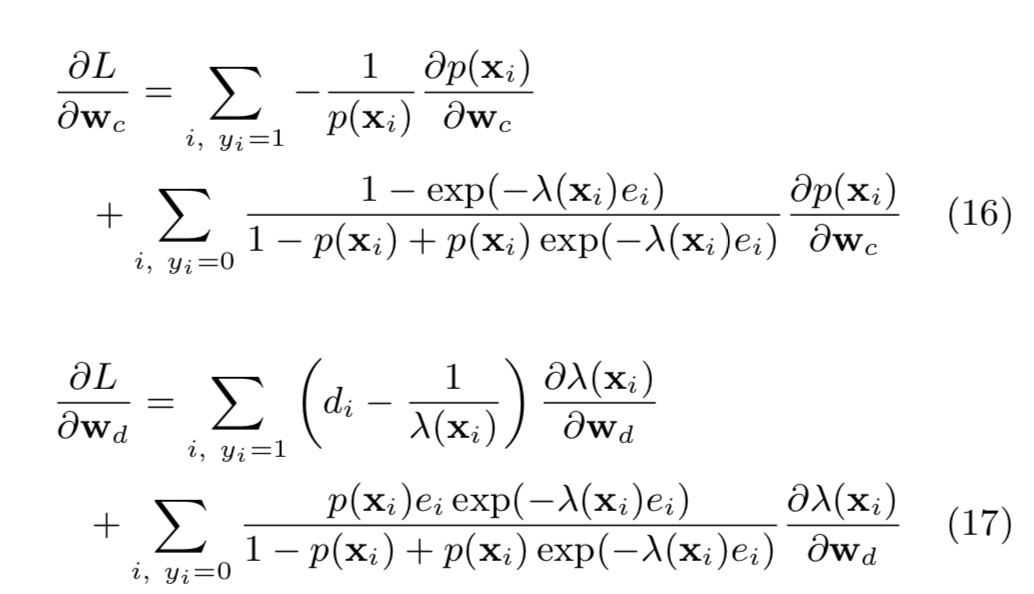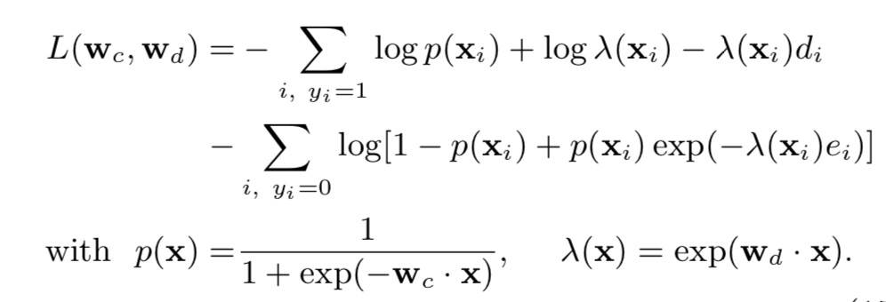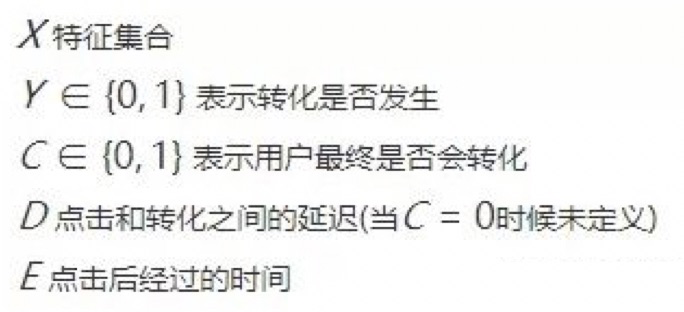 这一模型和生存分析中使用的模型有很大相关性。类似的,对转化问题来说,一些样本是censored(删失的),即在训练时间内无转化,而后续可能有转化。这种情况下,删失样本的转化延迟至少大于从点击开始的流逝时间。