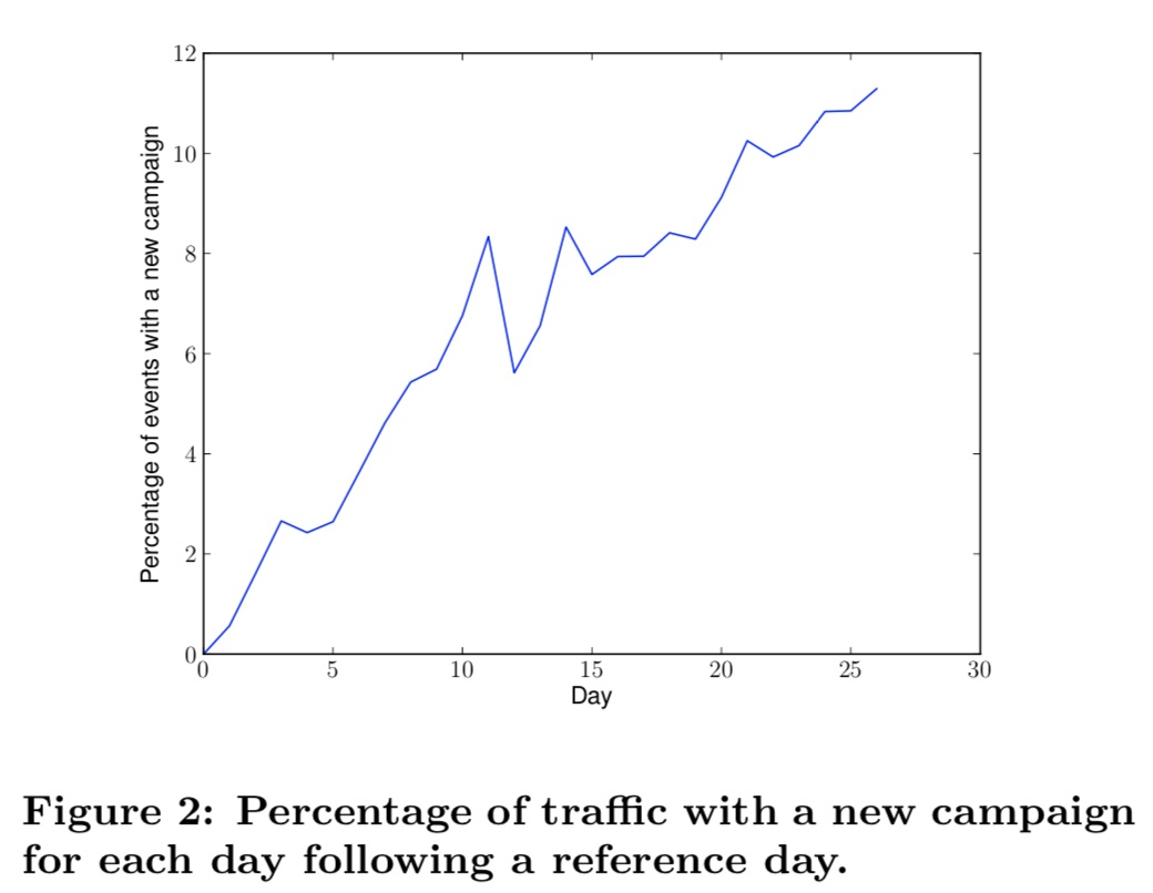 论文对广告的更新频率进行了统计分析,从某一天的广告作为base,统计随着时间增加新增广告的占比。累积26天后,新广告的占比为11.3%。