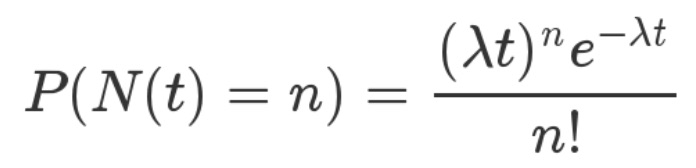 泊松分布:是指某段时间内事件发生的概率(例如,某网站平均每分钟有2次访问),即,,其中,t表示时间,n表示事件发生的次数,lamda表示事件发生的频率。