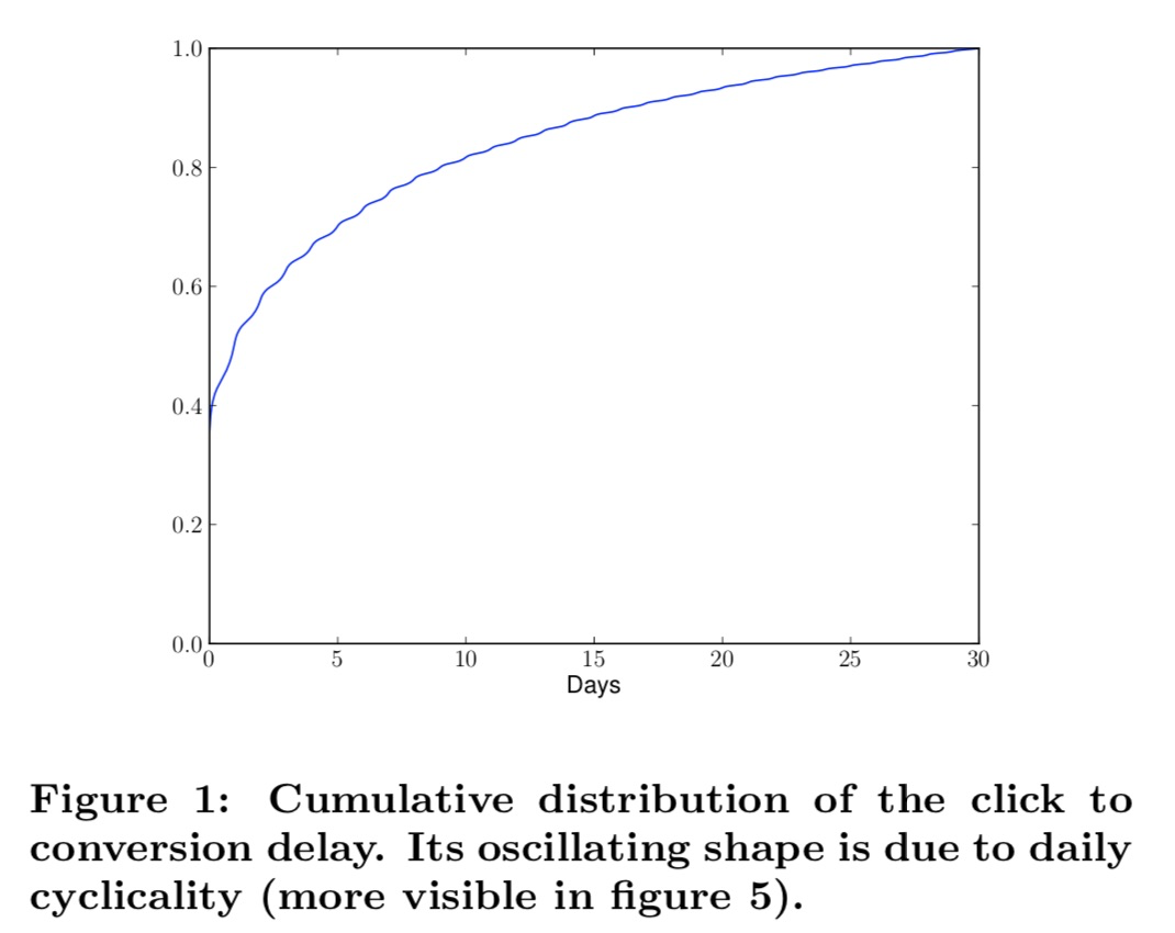 在参考ctr模型优化经验优化cvr模型时,会遇到一个问题,与点击(相比曝光)发生时间相比,转化发生时间要晚的多,很多时候转化事件会发生在广告被点击的几天(甚至一周)后。