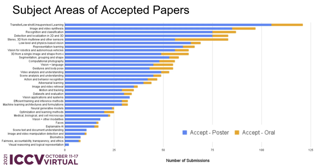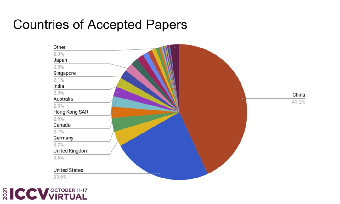 今年在论文收稿和入围数量方面,ICCV 21共收到论文投稿6236篇,最终入围1617篇,接收率约为 25.9%,较上届的25%有所上升。