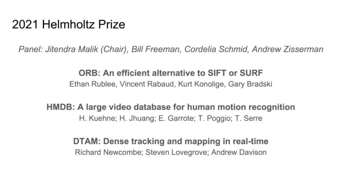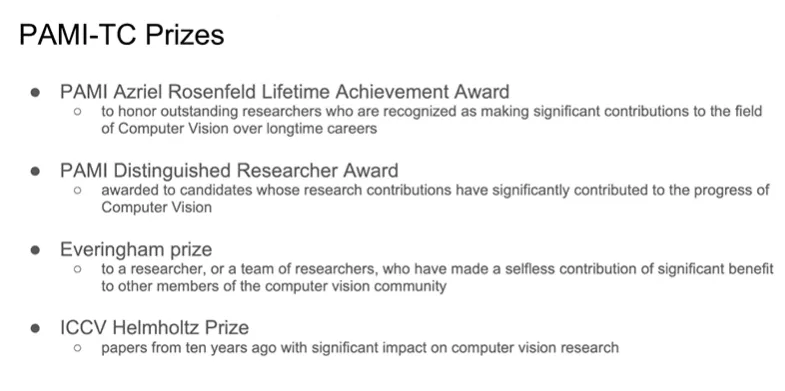 和往年一样,ICCV 21 还颁布了过往杰出研究类奖项 PAMI-TC 奖,其中包括4个奖项:Azriel Rosenfeld终身成就奖、杰出学者奖,Everingham 奖和ICCV Helmholtz 奖。