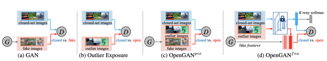 来自卡内基梅隆大学的论文一作Shu Kong在本文中基于上述问题,提出了全新解决方案OpenGAN,它在三个方面不同于其他使用GAN的开集方法:通过学习一个鲁棒的开集-闭集鉴别器充当开集似然函数;用假数据(由生成器合成)和真实的开集训练示例训练鉴别器;用OTS特征而不是RGB像素来训练GAN。