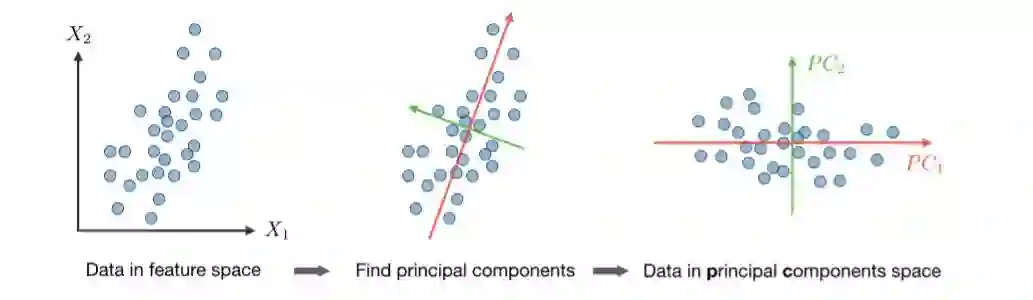 除了标准的定义,这些算法的原理图也非常重要,如上所示在 K 均值聚类中,四幅图展示了该算法的具体过程。首先随机初始化均值,然后将离均值近的样本分配为均值所代表的那一类,随后根据误差更新均值的位置,并直到模型收敛。主成分分析同样有非常好的可视化,如下 PCA 会先归一化数据特征,然后根据奇异值分解找出主成分,最后再将所有数据映射到主成分而实现降维。