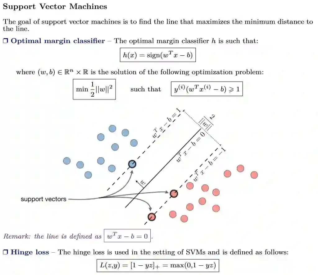 除了标准的定义外,很多重点概念还会用形象的图示表达出来,如下展示了监督学习中的支持向量机: