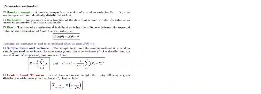 最后,该备忘录同样记录了参数估计,这对于机器学习来说是最为关键的概念之一,因为本质上机器学习就是需要通过大量样本对模型的参数进行估计,或者称为「学习」。此外,之所以高斯分布如此重要,最后面的中心极限定理可以给我们答案。也就是说,如果采样 n 个服从独立同分布的样本,那么当 n 趋近于无穷大的时候,这个未知的分布一定是接近于高斯分布的。