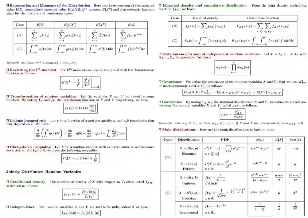 从排列与组合开始,这一部分介绍了概率与统计的概念定义。包括条件概率、贝叶斯法则、概率密度函数、概率分布函数与随机变量的均值和方差等。后面的统计也展示了非常多的定义与规则,包括分布的 K 阶矩、常见的离散型与连续型随机变量分布,以及样本均值、方差、协方差等数据特征。
