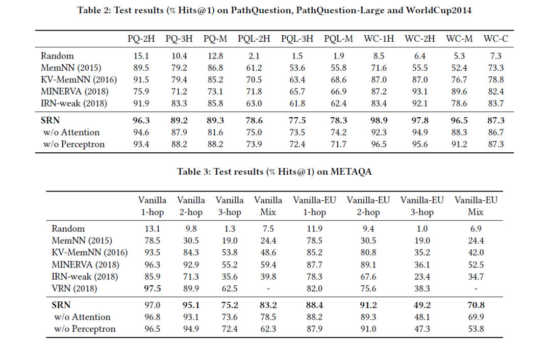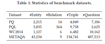 本文在三个benchmark数据集上评估SRN的效果,分别是通用领域的PathQuestion (含PQ和PQL两种)、足球领域的 WC2014 (其中单一关系问题集为WC-1H,2关系问题集为WC-2H,前面两个集问题集的混合集为WC-M,合取型问题集为WC-C)和电影领域的METAQA (原数据集有纯人工构建集Vanilla,也有使用机器翻译得到的其他数据集,本文仅使用Vanilla和Vanilla-EU,EU指未标注topic-entity。)。数据集的细节如下表1。