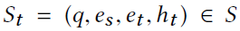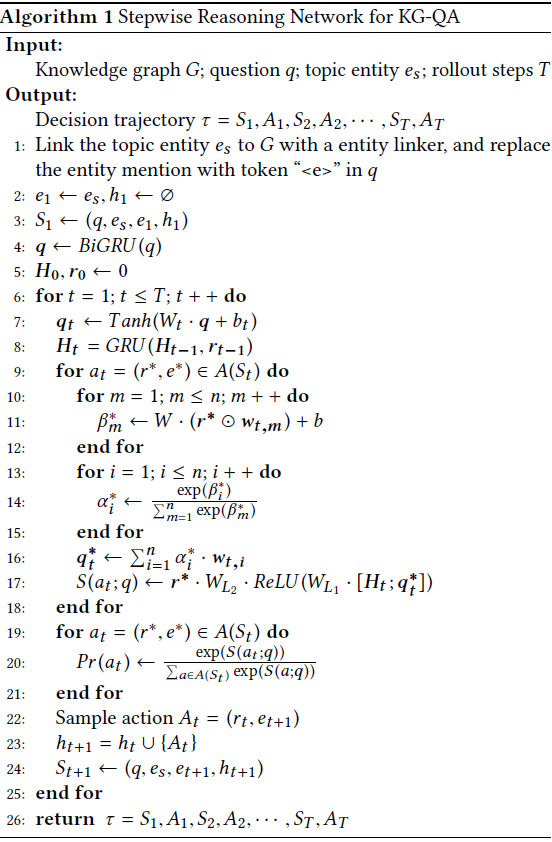中,q为问题,es是topic entity,et是从es搜索路径过程中,在时间步t时所访问的实体,ht则为agent之前所做的决策的集合。t时的候选行动集合基于St, A(St)由G中所有et的出边构成,即