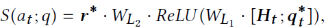 。本文使用双向GRU网络来将q转换为向量,并在每个时间步使用单层感知机转换向量,以将问题中的不同部分用不同步骤来区分。使用注意力机制来让表示中能包含关系信息。最终,概率分布基于包含了关系嵌入、能够感知到关系的问题表示和所编码的决策历史的语义得分。