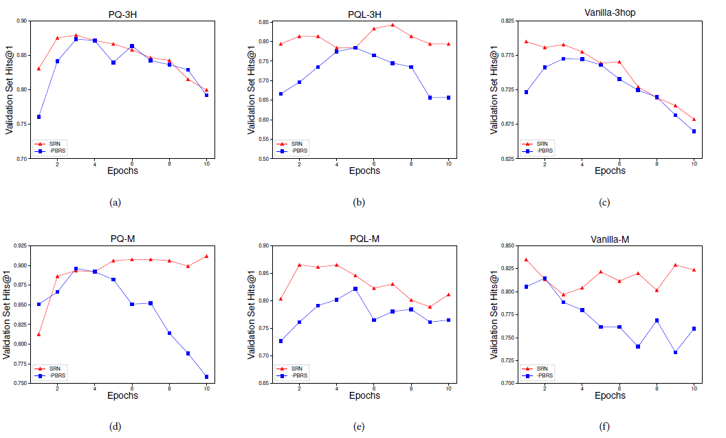 最后,本文还做了ablationstudy。首先,本文尝试去掉了策略网络中的注意力机制,结果如表2和表3。可以看出,没有了注意力机制的模型在所要求的三元组数量未知的情况下表现远不如原始SRN。然后,本文去掉了感知机,计算相似度改用余弦相似度。结果同样见表2和表3,可以看见在PQL这样的KG更大的数据集上表现不好。在Vanilla上,这样的模型在所要求的三元组数量已知的情况下表现还行,但未知的情况下则表现下降许多。另外,本文还在6个三跳数据集评估了去掉基于potential的reward shaping的SRN的训练过程,如图3,图种红线是原始SRN在验证集上的表现,蓝线是去掉基于potential的reward shaping的SRN在验证集上的表现。可以看出这一策略的确会加快收敛。