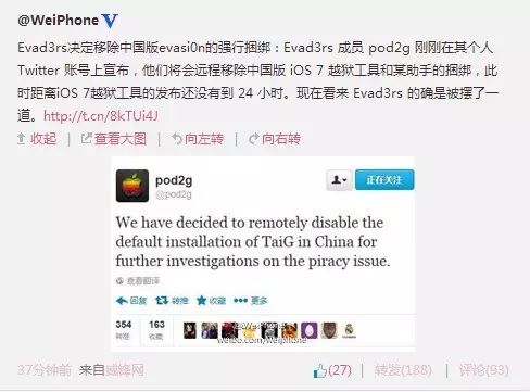 而且,不光是 evad3rs 被耍了,Cydia 的作者 saurik 也被耍了,他也发出了一些声明,其中就包括自己并没有收到 evad3rs 的通知来开发适合 iOS 7 的 Cydia,也解释了大部分人 Cydia 崩溃的问题。更可怕的是,saurik 两个月前就听说过太极助手想要寻找合作伙伴,也警告过 evad3rs 不要相信他们。