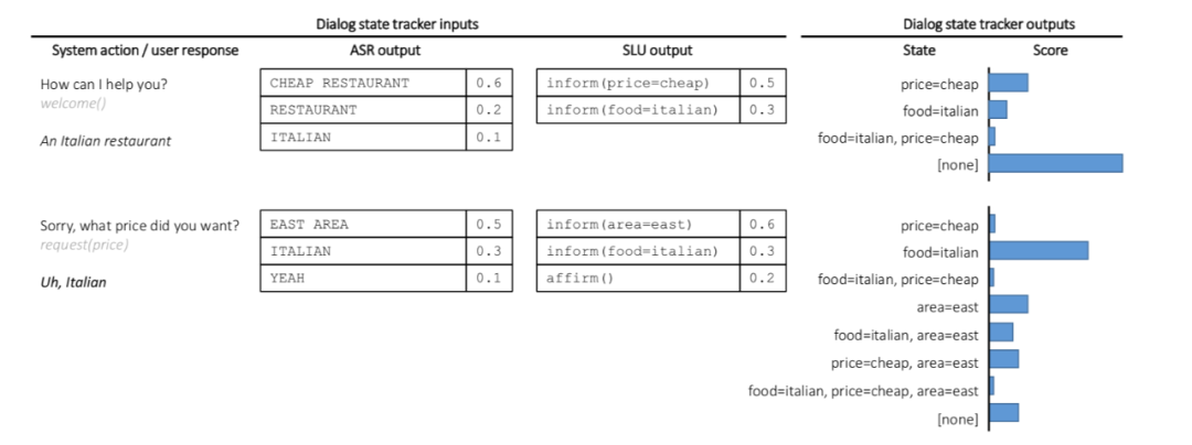 是历史的对话状态分布, 是更新后的对话状态, 是ASR/NLU是通过识别用户的话得出的状态, 是在给定的对话状态 和系统动作 下的采取的动作, 是在给定状态 和系统动作 下状态转变成 的概率, 是一个归一化的常量。这个公式定义了状态 是转移到 的概率。其中真实对话状态 和真实用户动作 被视为未观察到的随机变量,等式第一个求和项叫作观测模型,第二个求和项叫作转移模型。