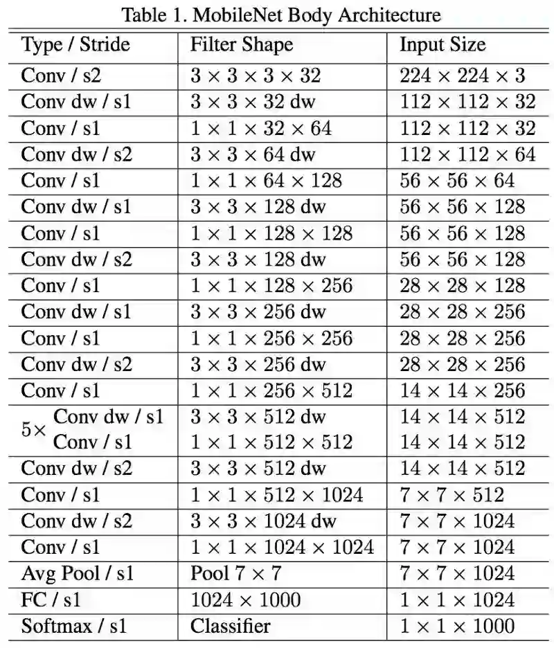 2017年4月,出现了一个新的MobileNets架构。该架构使用可分卷积以减少参数数目。可分卷积和前文提及的Xception相同。论文声称大大减少了参数——据论文报告,FaceNet案例中参数减少了一半。下面是该模型的完整架构: