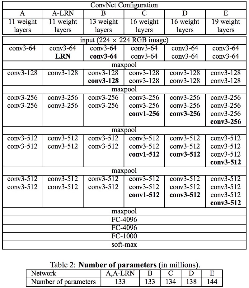 VGG网络使用多个3x3卷积层来表示复杂的特征。注意上表VGG-E的3、4、5块:多次使用256x256和512x512的3x3过滤器构成序列,以提取更复杂的特征,以及这些特征的组合。这相当于3个大型的带有512x512过滤器的卷积层!显然这导向了大量的参数,以及更强的学习能力。然而,由于很难训练这些网络,需要将其拆分成逐层叠加的小型网络。这是因为缺乏正则化模型的强力方法,某种程度上这限制了大量参数提供的巨大搜索空间。