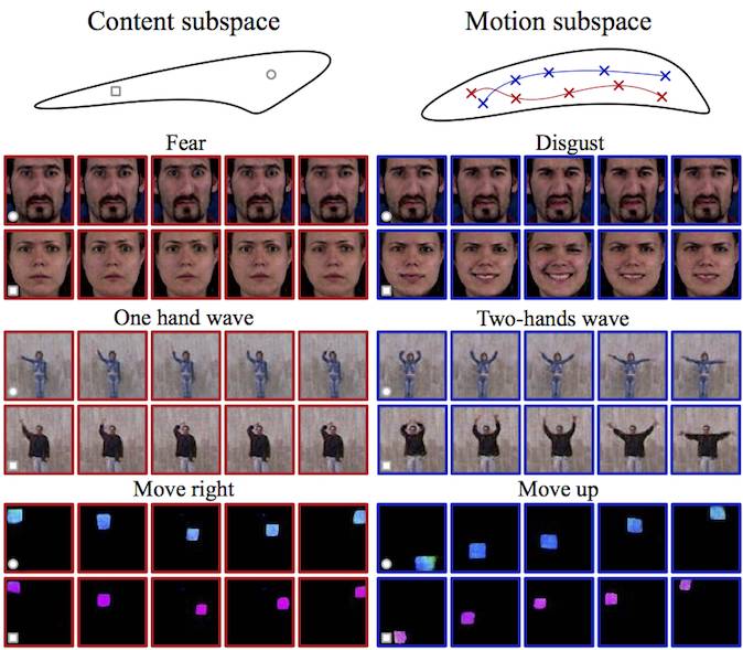 Sergey Tulyakov, Ming-Yu Liu, Xiaodong Yang, Jan Kautz, "MoCoGAN: Decomposing Motion and Content for Video Generation"