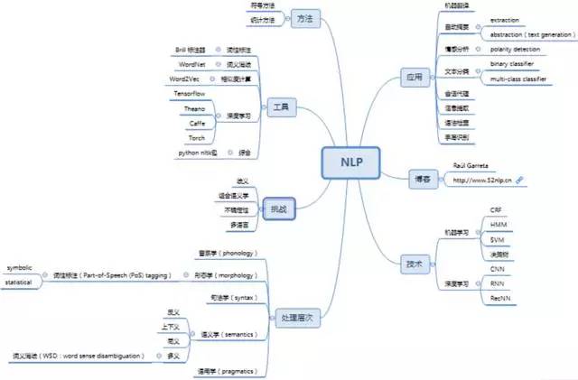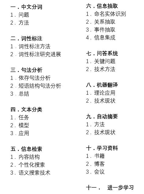 本文针对其中几个主要领域的研究现状和进展,通过论文、博客等资料,结合自身的学习和实践经历进行浅显地介绍。由于个人实践经验不足,除中文分词、自动文摘、文本分类、情感分析和话题模型方面进行过实际业务的实践,其他方面经验欠缺,若有不当之处,欢迎童鞋们批评指正!