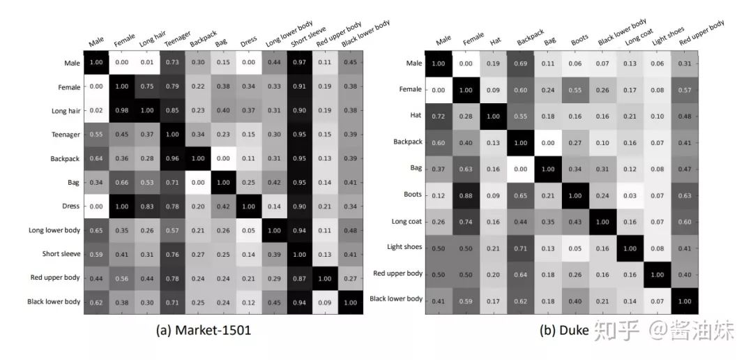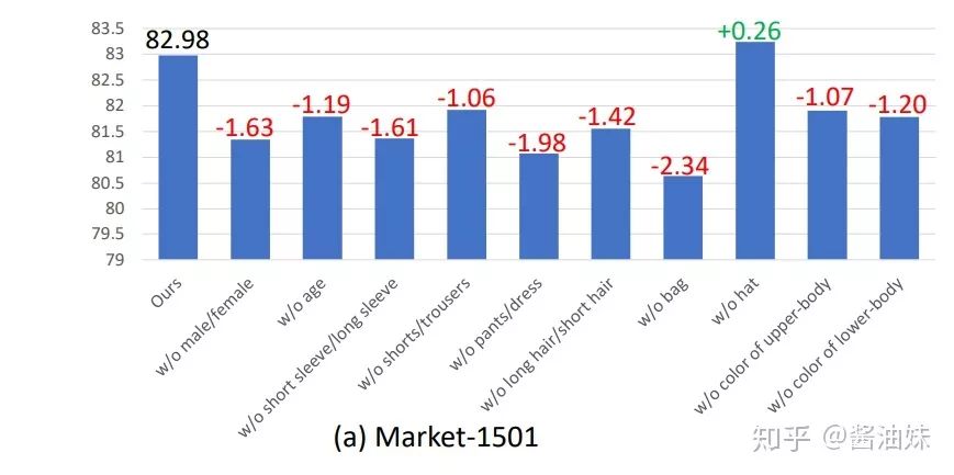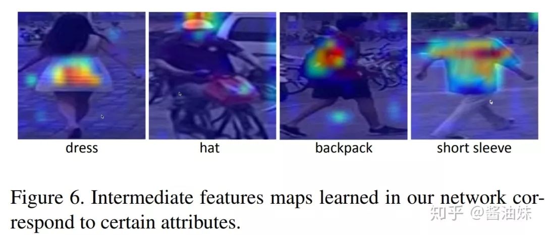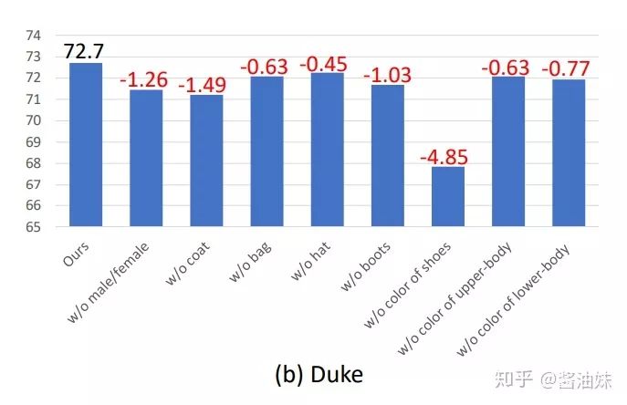 而在DukeMTMC-reID上则是鞋子的颜色。这也是make sense的,因为我自己实验也发现attention往往会忽略鞋子(因为CNN也是会偷懒的),而attribute强调了这部分。