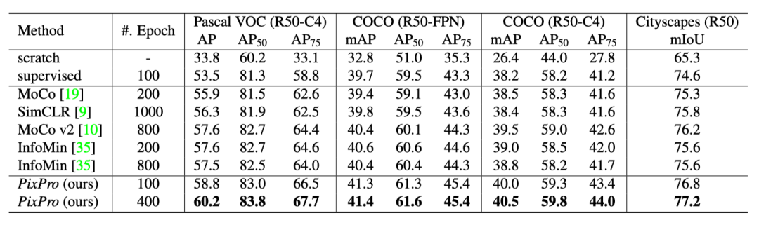表4:PixPro 结合下游任务网络以及实例级别对比学习结果