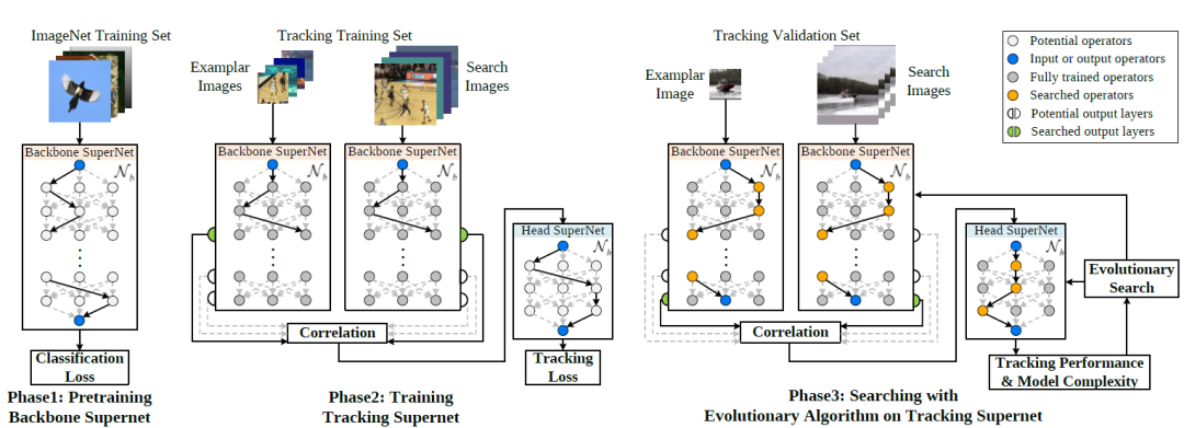 LightTrack 的搜索流程包括三步:(1)主干网络超网预训练,(2)目标跟踪超网训练,(3)利用进化算法从目标跟踪超网中搜索最优的子结构。