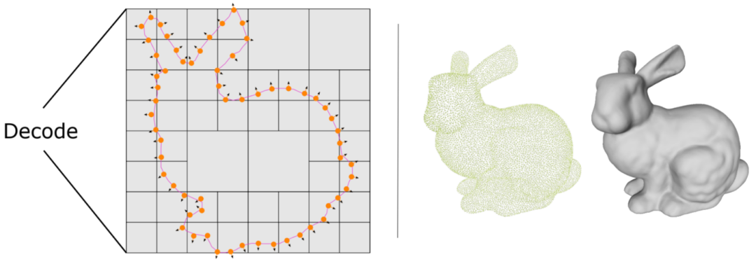 图1:方法概念示意图。左图:IMLSNet 通过神经网络解码生成了一个八叉树的脚手架,在八叉树的叶子节点进一步生成点集,通过隐式移动最小二乘函数定义隐式曲面。右图:点集和点集定义的高质量三维曲面。
