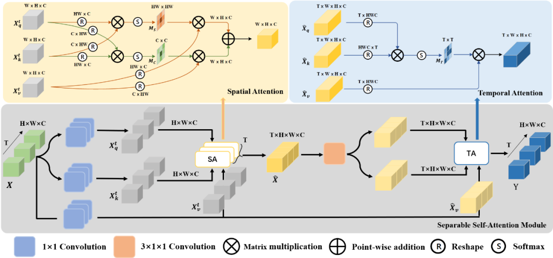 图16:可分离自注意力模块。黄色代表空域注意力(SA),蓝色代表时域注意力(TA)