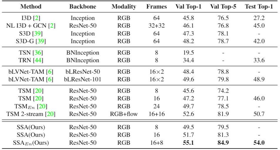 实验结果表明,SSAN 不仅在传统的视频分类任务上取得了优异的效果,而且在跨模态的视频-文本检索任务上取得了突破性的成绩。在视频分类数据集 Something-Something V1上(如表6),SSAN 在验证集和测试集都取得了最佳结果。对于视频检索任务,SSAN 提取的特征在 MSR-VTT 数据集上的表现比之前最好的方法提高了12%。