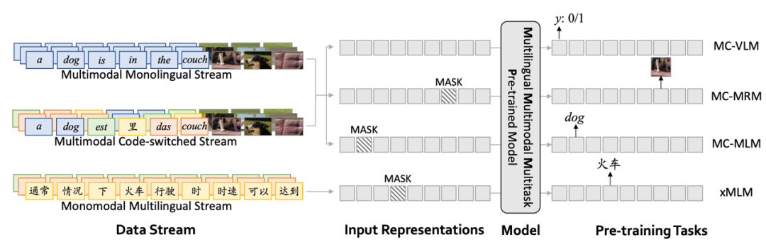 M3P 使用了类似 BERT 的自注意力 Transformer 结构,通过多任务学习可以让预训练阶段同时优化多个目标。具体地,研究员们设定了两个训练目标——多语言训练和多模态语码切换训练(MCT)。多语言训练使用了只包含文本的多语言语料训练,而多模态语码切换训练则使用了仅用英文的文本-图像对和通过语码切换生成的多语言文本-图像对训练。
