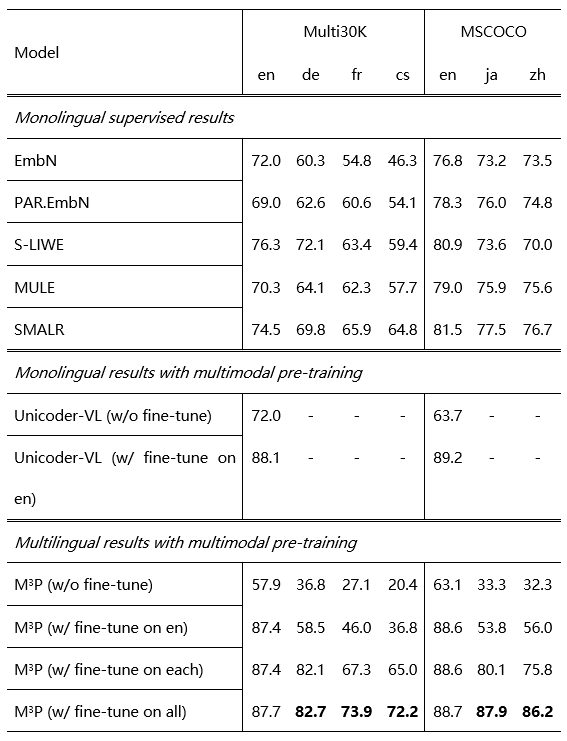 实验表明,M3P 在 MSCOCO 和 Multi30K 的多语言文本图像检索任务的非英语测试集上取得了新的 SOTA 结果,并在英语测试集上取得了与前人可比的结果。实验还表明多模态语码切换训练(MCT)可以极大的增强模型在低数据场景上的表现。