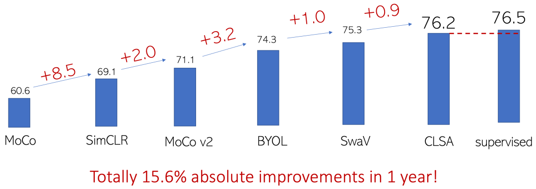 图8:MoCo 后一年内自监督预训练方法在 ImageNet-1K 线性评估上提升了15.6个点