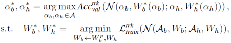 目前,主流的目标跟踪模型由两部分构成:基于 ImageNet 预训练的、用于特征提取的骨干网络,和用于目标定位的预测头部。这两部分共同决定了跟踪器的性能,因此研究员们将它们看作一个整体,在目标跟踪数据集上联合搜索最适合跟踪任务的“骨干网络-预测头部”结构。此外,由于骨干网络需要在 ImageNet 上进行预训练,而对所有可能的骨干网络结构分别独立做 ImageNet 预训练在计算量上是无法承受的,所以研究员们将所有可能的结构统一为一个超网,全部子网络共享超网参数,并通过对超网进行预训练来达到对所有子结构做预训练的效果。搜索过程可以用以下公式描述: