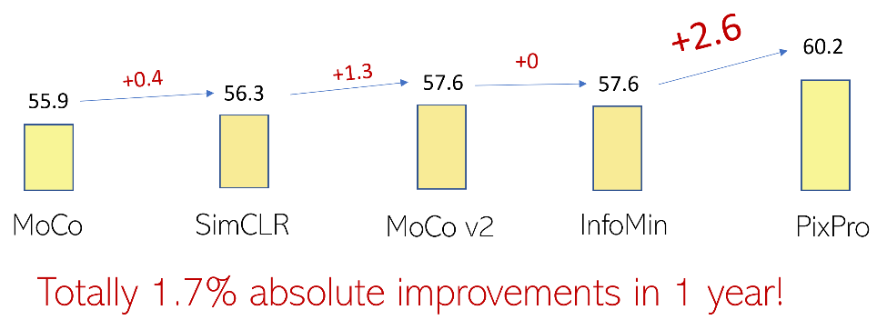 图9:MoCo 后一年内自监督预训练方法在 Pascal VOC 物体检测任务上提升了1.7个点,PixPro 一次带来额外2.6个点的提升