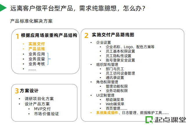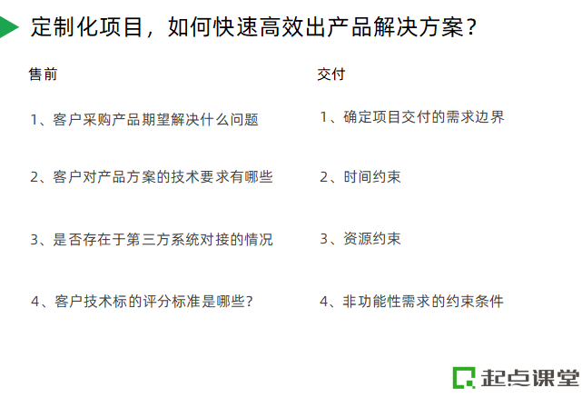 这个部分,老师将通过售前和交付2个维度量进行问题剖析,并分享一套定制化产品解决方案快速产出4步法。