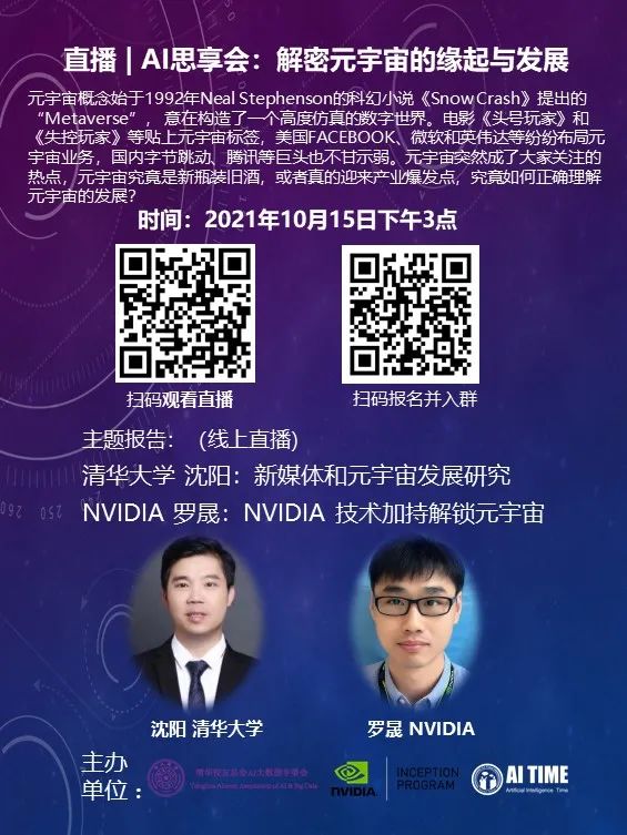 结合近期清华大学沈阳老师团队发布《元宇宙发展研究报告》及再早些时候英伟达推出Omniverse平台等,我们将于10月15日下午3点举办线上直播AI思享会,我们邀请到清华大学沈阳老师为大家讲述元宇宙的孕育及发展,及元宇宙背景下虚拟与现实的关系等,以及英伟达Solution Engineer罗晟为大家讲解英伟达Omniverse技术平台如何支持元宇宙的发展等。