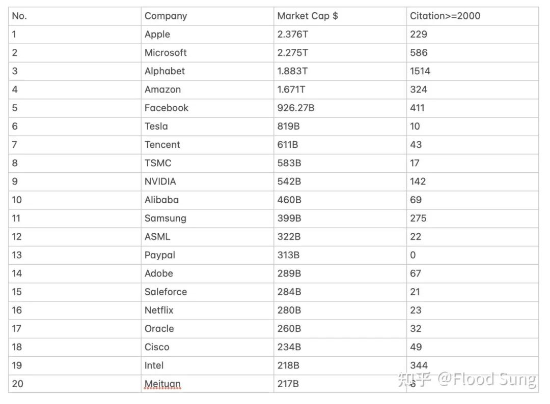我们参考https://companiesmarketcap.com/tech/largest-tech-companies-by-market-cap/ 列一下前20科技公司的市值(市值>2000亿美金)与citation>=2000的人数关系