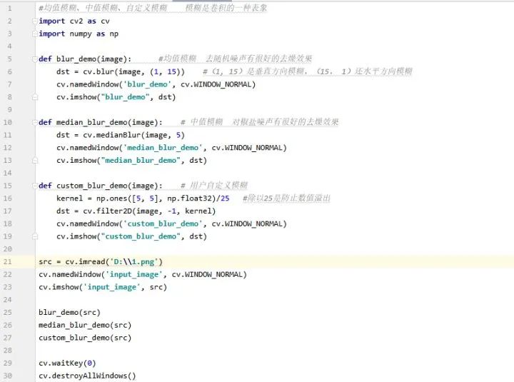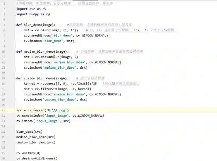 在OpenCV中,我们使用cv.medianBlur()这个函数即可实现。