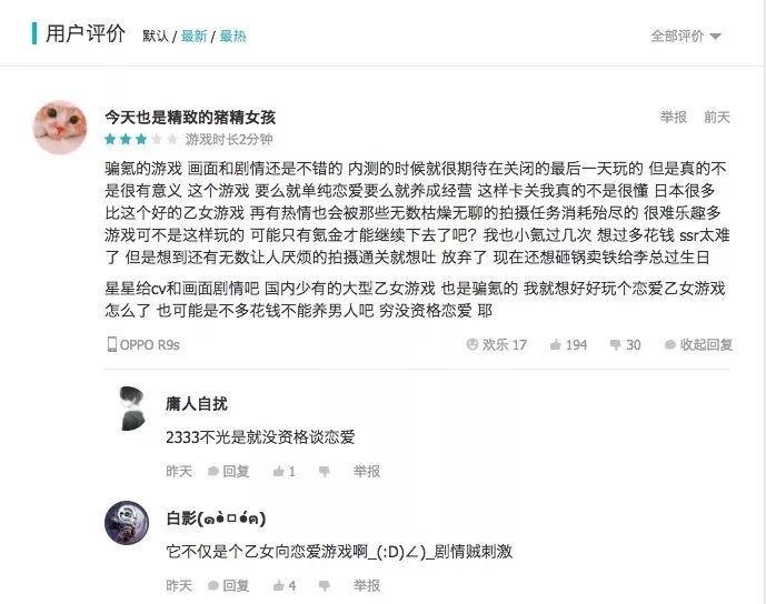 “第三制作略粗糙,基本就是静态画面,玩法单一,最感兴趣的互动部分占比少,声优不足以支撑我花大量时间去肝。”