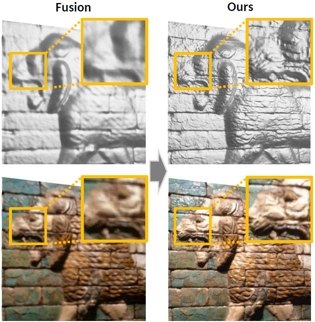 通过大量的实例和评估,我们证明了我们的方法显著地提高了重建场景几何中的细节等级,并有助于一致的表面纹理恢复。