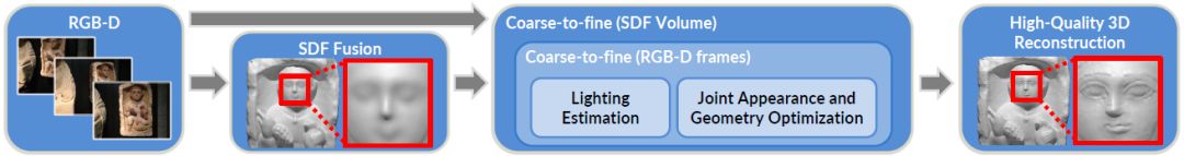 图2。我们的结合处外观和几何优化方法的概述。我们的流程将场景的RGB-D数据作为输入,并将其融合到符号距离场(SDF)中。在嵌套式从粗到细的方法中,估计空间变化的光照,并用于联合优化场景的外观和几何形状,产生高质量的3D模型。