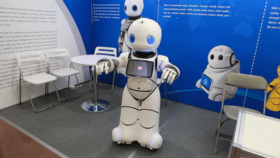 此次康力优蓝带来的是商用服务机器人优友U05,它具备58种工作角色,能够应用在商场、展馆、银行、医院等场景,能够精准识别人脸、自主避障行走、进行自然的语音交互以及灵活的人类动作模拟。其可爱的外形惹得参观者们纷纷驻足,优友不时地眨着那双灵动的蓝眼睛,胸前的屏幕上跳跃着红心以表明自己的心情,还顺势展示了一下自己灵活的手指舞。