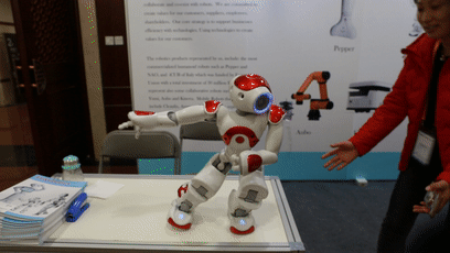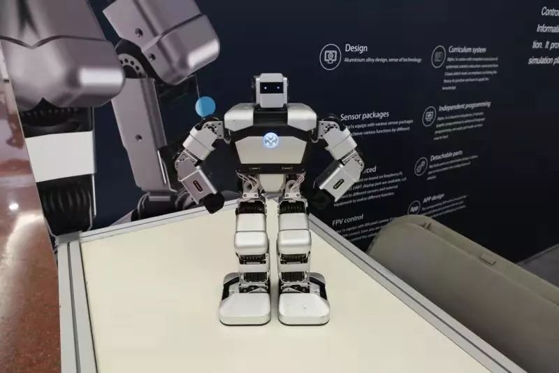 另一台则是大名鼎鼎的NAO机器人。NAO身上安装了两个摄像头,可以对周围物体进行识别跟随,用户也可以通过摸头和脚面对NAO进行相应的交流。目前NAO已被人大附中等校安排进入常规高中教育体系。展区里NAO还在现场热舞了一段江南Style。