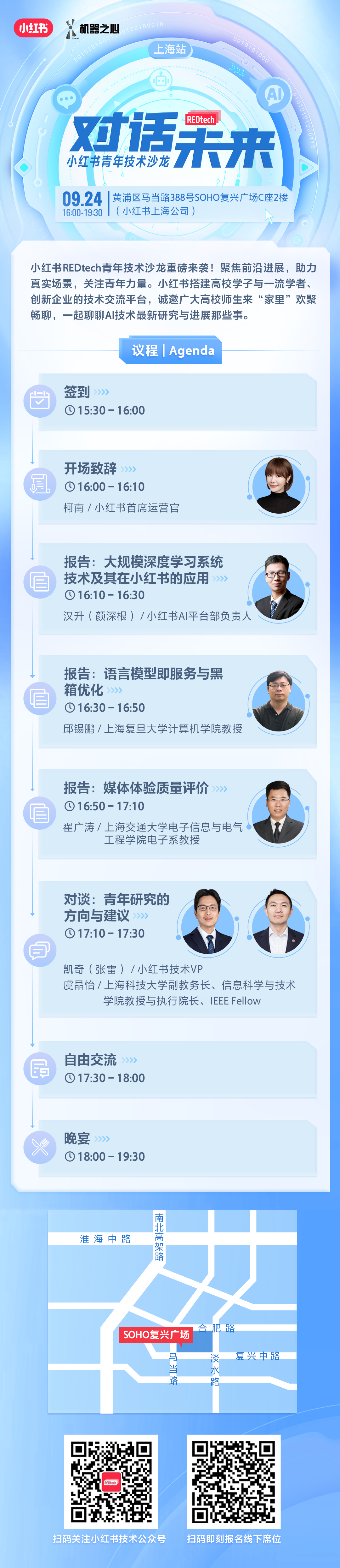 与高校顶尖学者、技术大神共论AI前沿进展与研究!9月24日上海,欢迎高校青年学子一起参与这场技术沙龙与私享晚宴。
