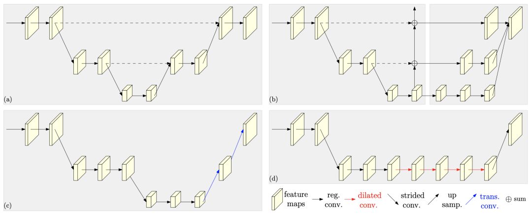 一共总结了两类 high-to-low 和 low-to-high 结构:以 Hourglass 为例的降分辨率和升分辨率完全对称的方式;以 Simple Baseline 为例降分辨率采用较重的分类基网络,升分辨率采用轻量的结构,这种轻量的方式包括:反卷积、空洞卷积。分别对应下图 (a)、(b)、(c)、(d):