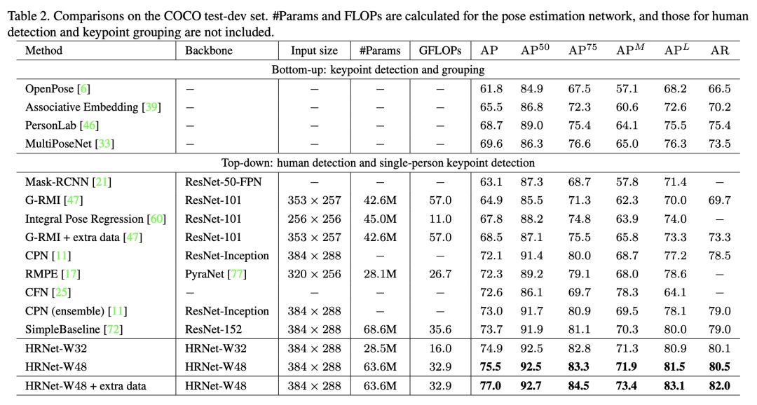 从上表可以看出 HRNet 均要高于其他自底向上的方法,无论是小型网络 HRNet-32 还是大型网络 HRNet-48 均较 Simple-Baseline 有 1.2 到 1.8 倍的提升。