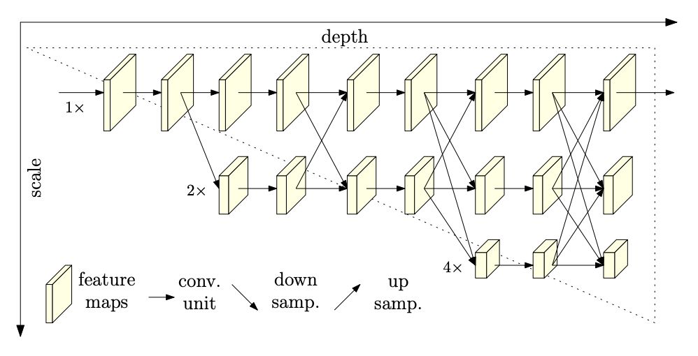整个网络可以在任意的阶段(子网络)进行跨尺度的信息交融,其完整的形式如下图: