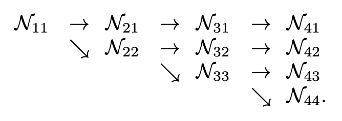 每一阶段的分辨率特征图都由上一阶段的分辨率特征图以及它的下采样特征图组成,每一条子网络中特征图的尺度不变,但是相邻两条子网络的尺度随着不断加入其尺度会减小,其具体并行结构图下图所示: