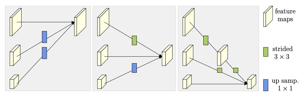 虽然每条子网络内部特征图会接受来自相邻子网络上层特征传递给他们的其他尺度信息,这样的交叉特征融合怎么进行的呢?其分为三种情况,如下图所示:
