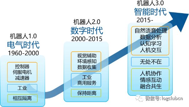 机器人 1.0(1960-2000),机器人对外界环境没有感知,只能单纯复现人类的示教动作,在制造业领域替代工人进行机械性的重复体力劳动。机器人 2.0(2000-2015),通过传感器和数字技术的应用构建起机器人的感觉能力,并模拟部分人类功能,不但促进了机器人在工业领域的成熟应用,也逐步开始向商业领域拓展应用。机器人 3.0(2015-),伴随着感知、计算、控制等技术的迭代升级和图像识别、自然语音处理、深度认知学习等新型数字技术在机器人领域的深入应用,机器人领域的服务化趋势日益明显,逐渐渗透到社会生产生活的每一个角落。在机器人 2.0 的基础上,机器人 3.0 实现从感知到认知、推理、决策的智能化进阶。
